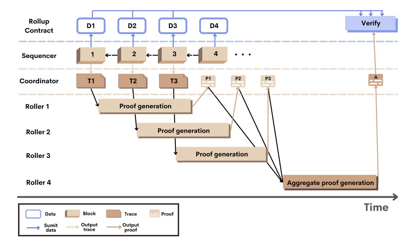 - (Proof generation) After generating the block proof P for the i-th block, the Roller sends it back to the Coordinator. Every k blocks, the Coordinator dispatches an aggregation task to another Roller to aggregate k block proofs into a single aggregate proof A.