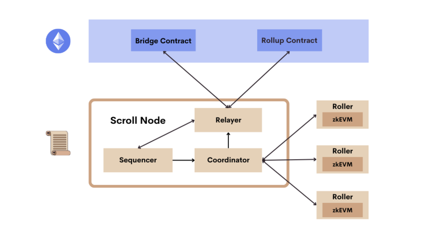 - Scroll Node: Constructs L2 blocks from user transactions, commits them to the Ethereum base layer, and passes messages between L1 and L2.