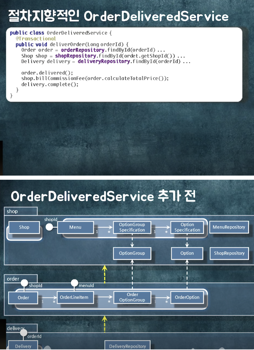 - 배달 완료 로직에 대해서 shop, order, delivery 객체의 협력이 필요하다.