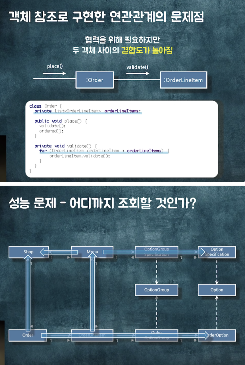 - 객체 참조로 구현한 연관관계는 두 객체 사이의 결합도가 높아진다.