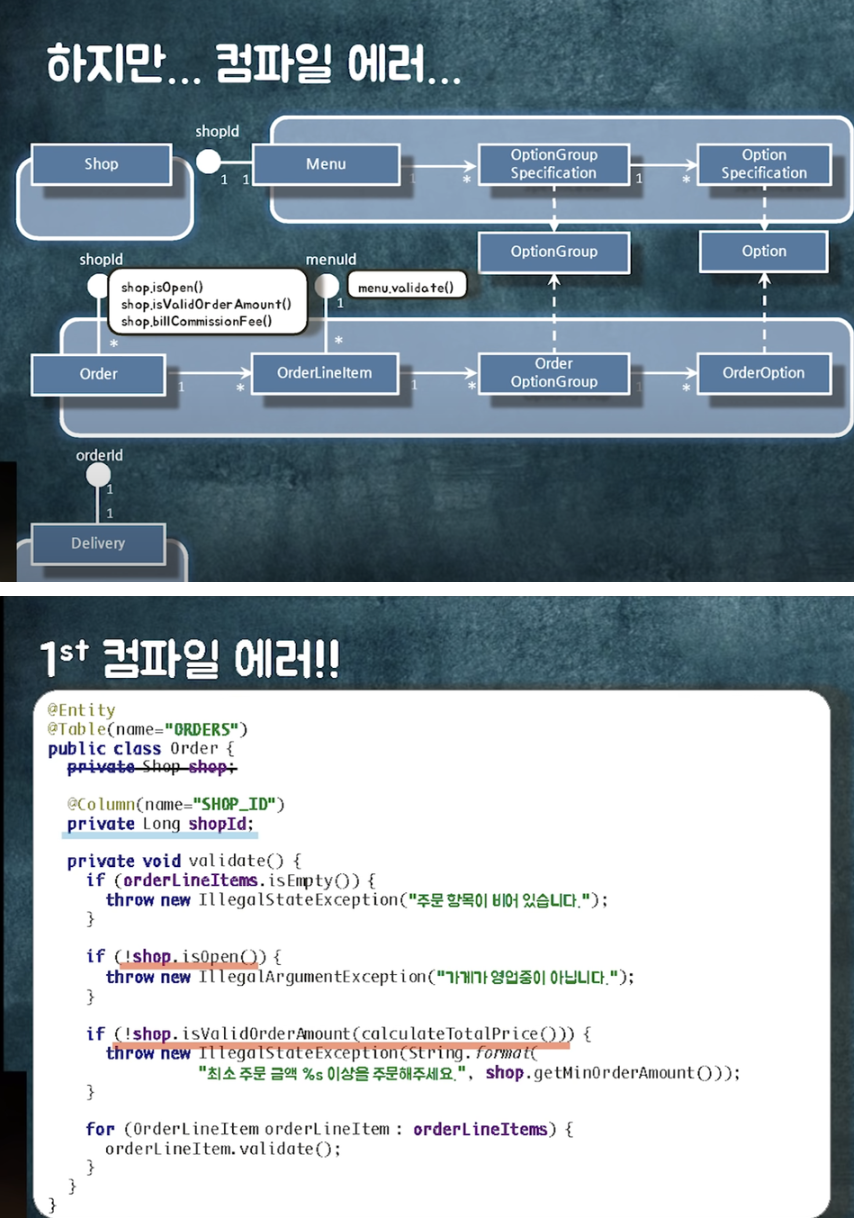 - 하지만 배민의 경우에는 가게당 1개의 장바구니만 허용한다 → 도메인 제약사항을 공유하기에 연관관계로 묶음