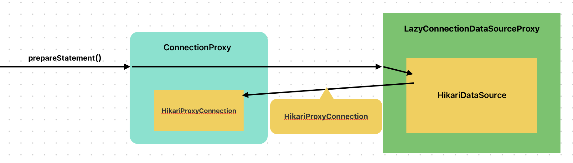 LazyConnectionDataSourceProxy은 DB 커넥션이 실제로 필요할 때, 다시 말해 쿼리가 실행될 때 커넥션을 얻어옵니다.