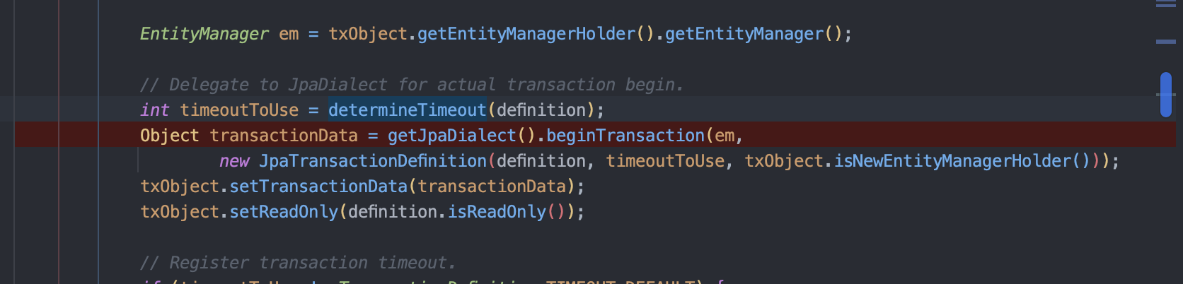 @Transactional 어노테이션이 있는 클래스는 해당 클래스의 메서드를 호출할 때, TransactionInterceptor 에서 해당 요청을 가로채 invoke() 메서드를 실행시킵니다. 해당 호출 내부에서 트랜잭션을 만들게 되는데 JpaTransactionManager 내부의 beginTransaction() 에서 트랜잭션을 시작하면서 DataSource로부터 getConnection() 을 호출합니다.