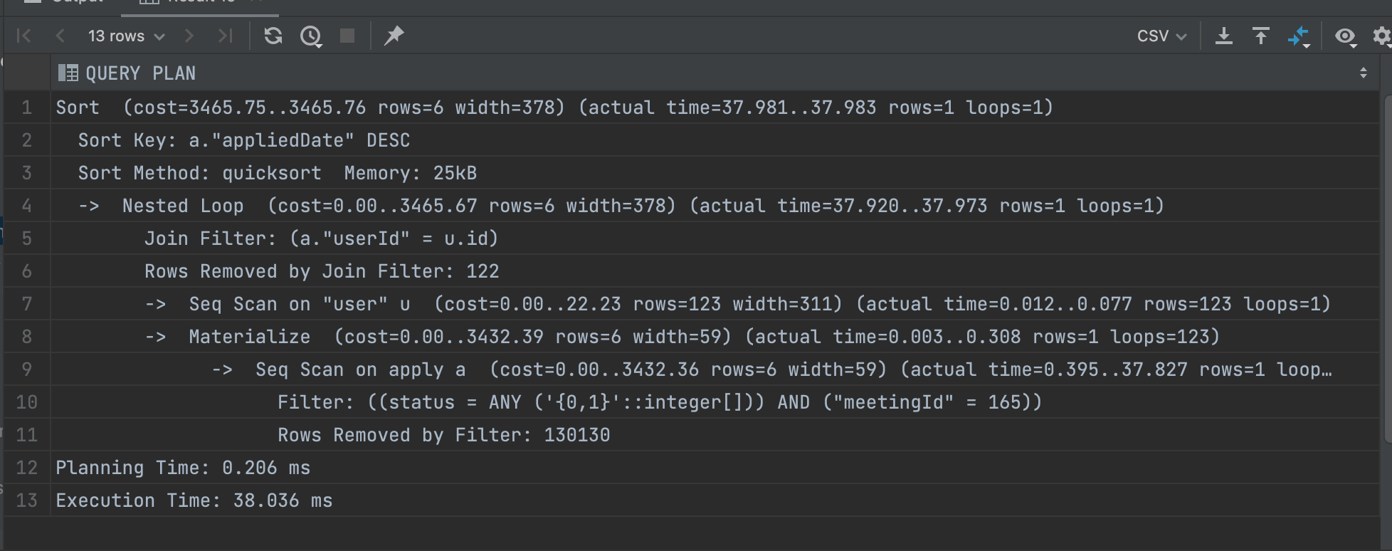 인덱스 순서는 meetingId -> status -> applied_date 순으로 설정했습니다.