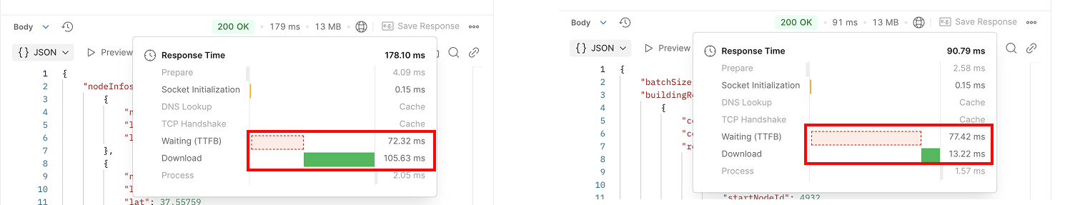 하지만 저희처럼 응답 데이터가 수 MB 단위에 달하는 경우, 단순히 Download 시간을 제외해버리는 것은 오히려 병목 원인을 놓칠 수 있습니다.
