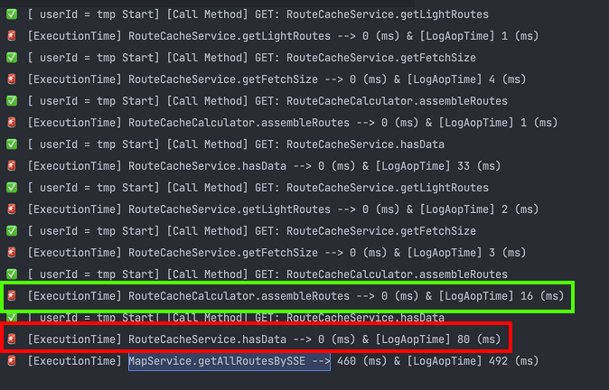 처음에 생각했던 것은 비즈니스 로직에 문제가 있을까 생각이 들었습니다. 왜냐하면, 저희가 캐싱된 데이터를 단순히 서빙하는 것이 아닌, 내부적으로 복잡한 계산로직을 거치게 됩니다. 그래서 해당 로직의 소요시간 AOP를 통해 측정해봤습니다.