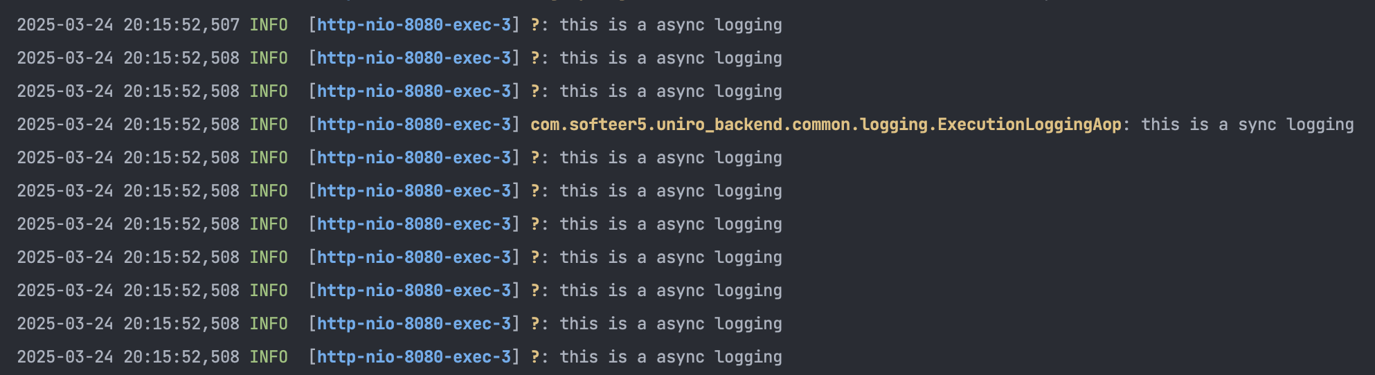 결국 많은 요청들이 서로 콘솔에 로그 메세지를 출력하다보니 병목현상이 발생하여 400ms 응답시간이 나오게 된 것입니다. 그래서 이 문제를 해결하기 위해 비동기 로깅 방식을 도입해봤습니다.