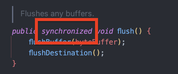 여기서 OutputStreamManager는 synchronized 블록을 사용해서 스레드 안전하게 System.out.write()를 호출합니다.