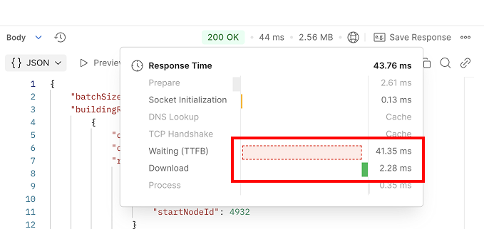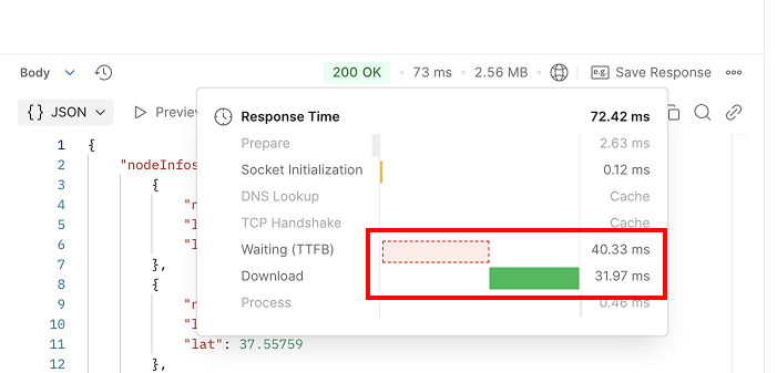 총 73ms의 응답 시간 중, 서버의 비즈니스 로직 처리에는 약 40ms가 소요되었고, Download 시간(서버의 직렬화 시간 포함)은 약 31ms가 소요되었습니다.