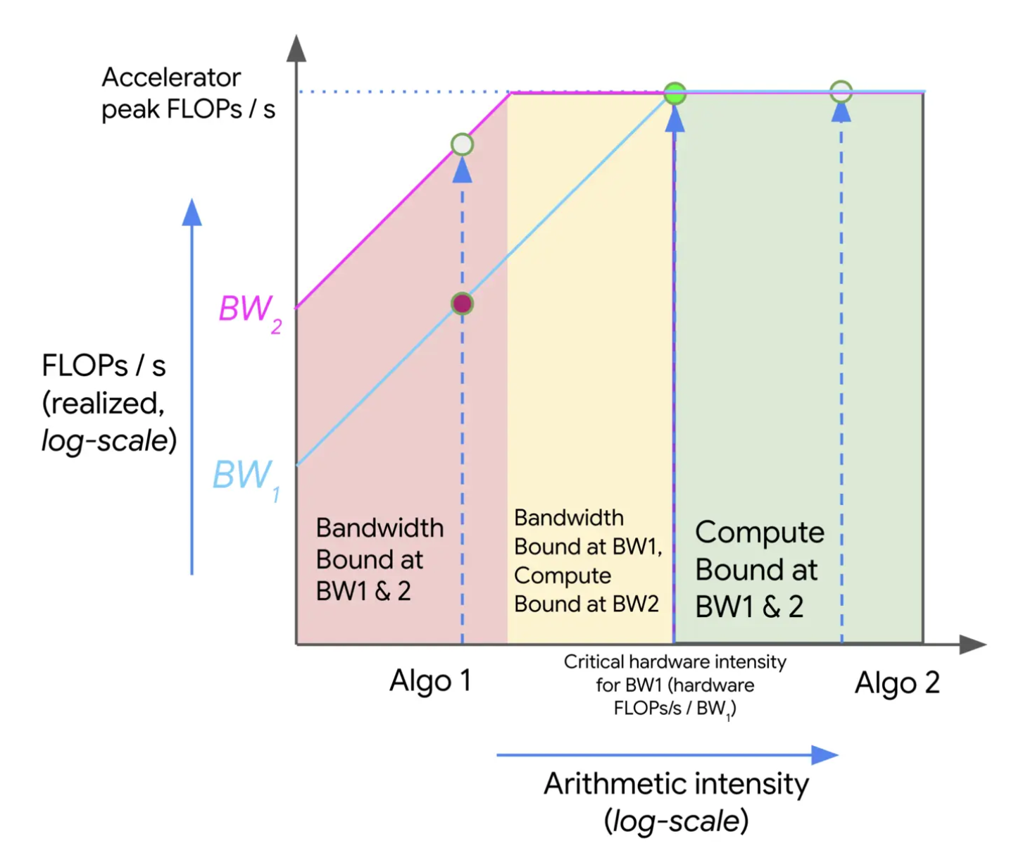 - 예를 들어, TPU v5e의 임계값은 약 240 FLOPs/Byte입니다.