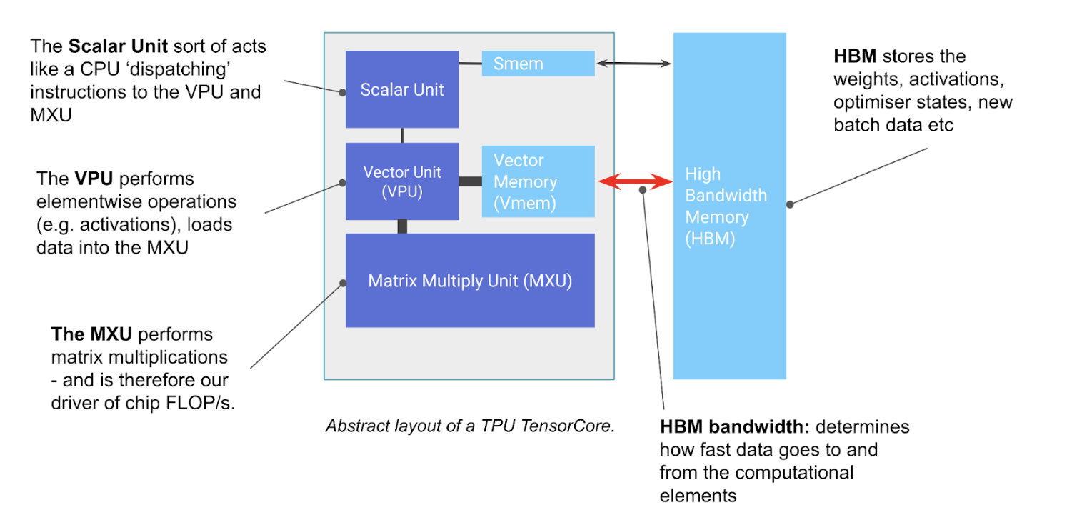 - TPU는 단순합니다: 거대한 행렬 곱셈 기계(MXU)에 초고속 메모리(HBM)를 붙여놓은 것입니다.
