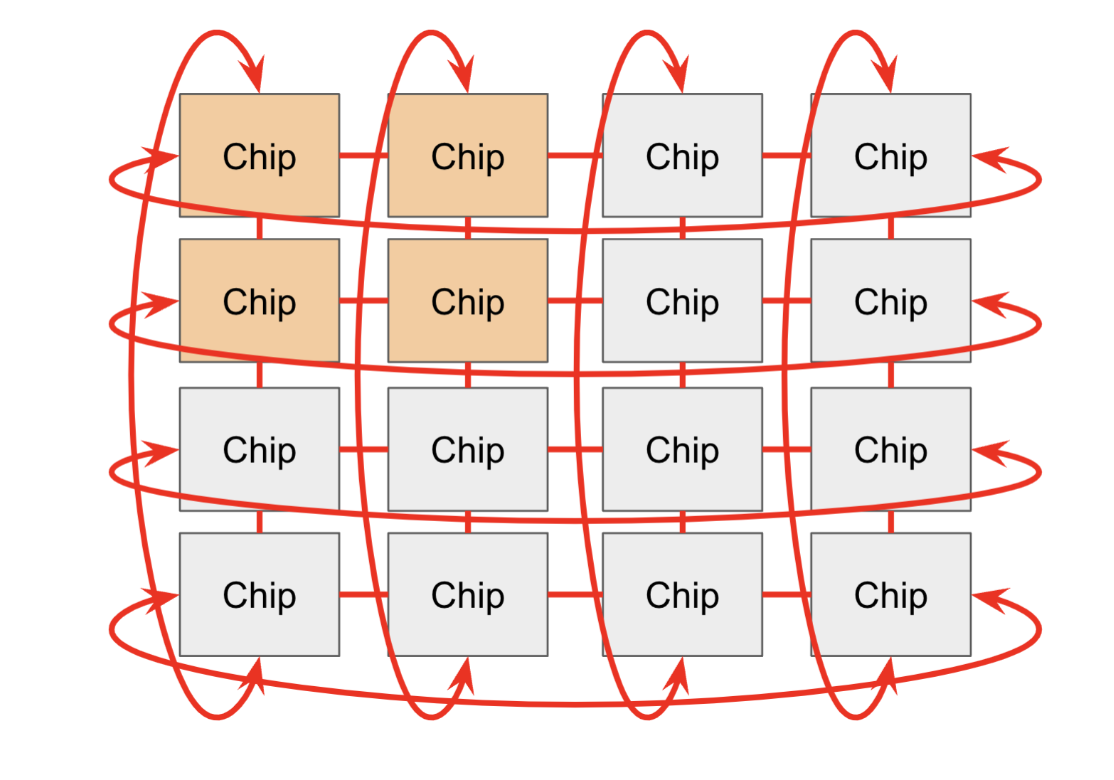 - 구조: 토러스(Torus) 구조를 사용합니다. 즉, 내 옆, 위, 아래에 있는 이웃 칩들과 직접 손을 잡고 있는 형태입니다. (GPU가 복잡한 스위치 장비를 통해 연결되는 것과 대조적입니다.)